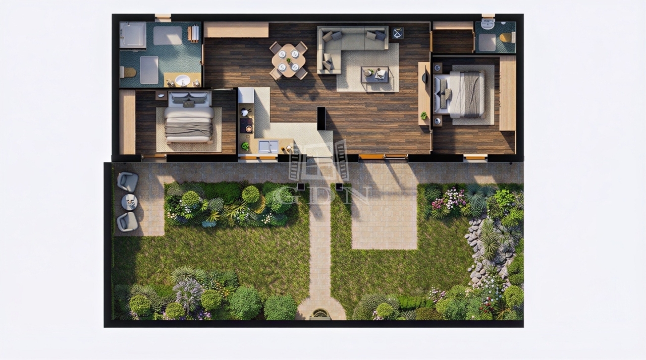 Az épület kiváló elosztású, napfényes, teraszkapcsolatos, amerikai konyhás, tágas nappali, 2 hálószoba, fürdő, 2 toalett kerül kialakításra.