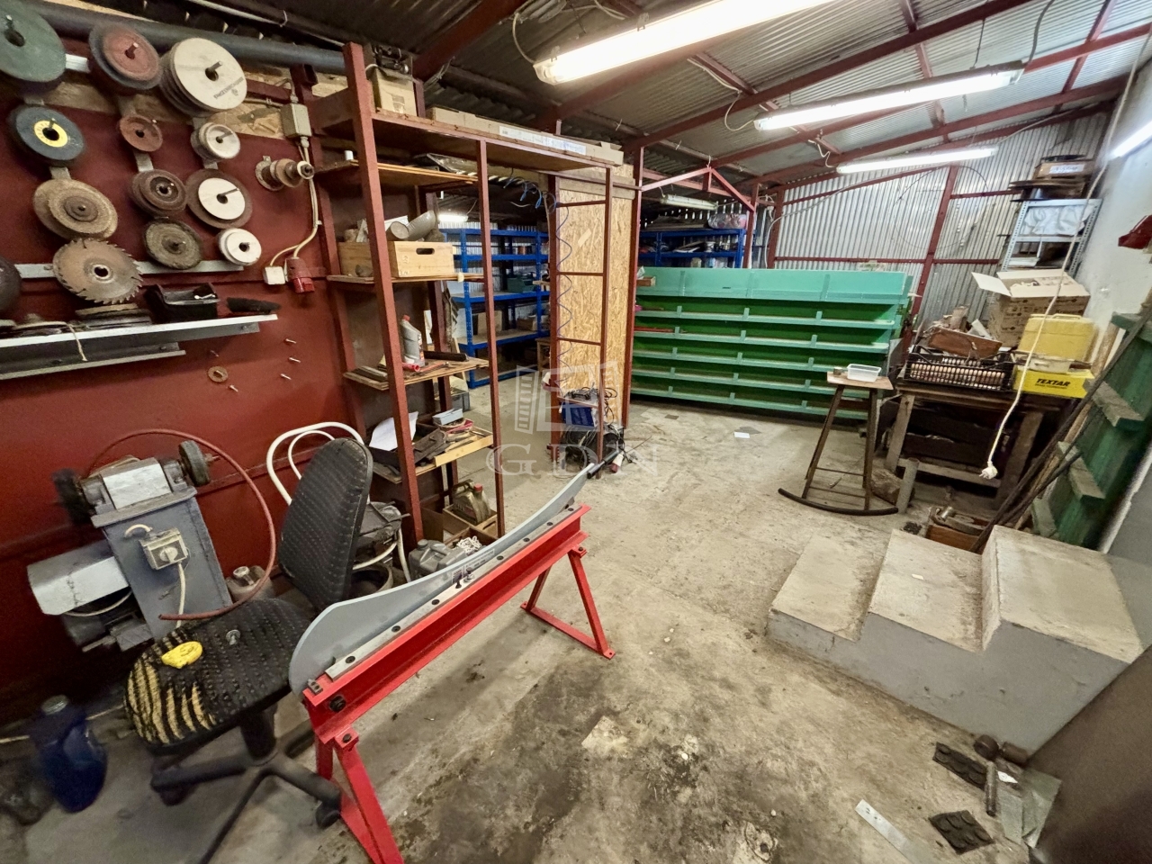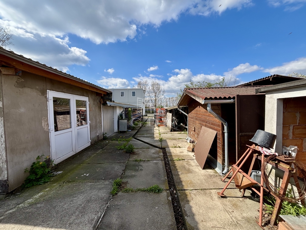A területen több fedett tároló, valamint egy szerelőaknás garázs is található. A parkolás több jármű számára is kényelmesen megoldott a telken belül.