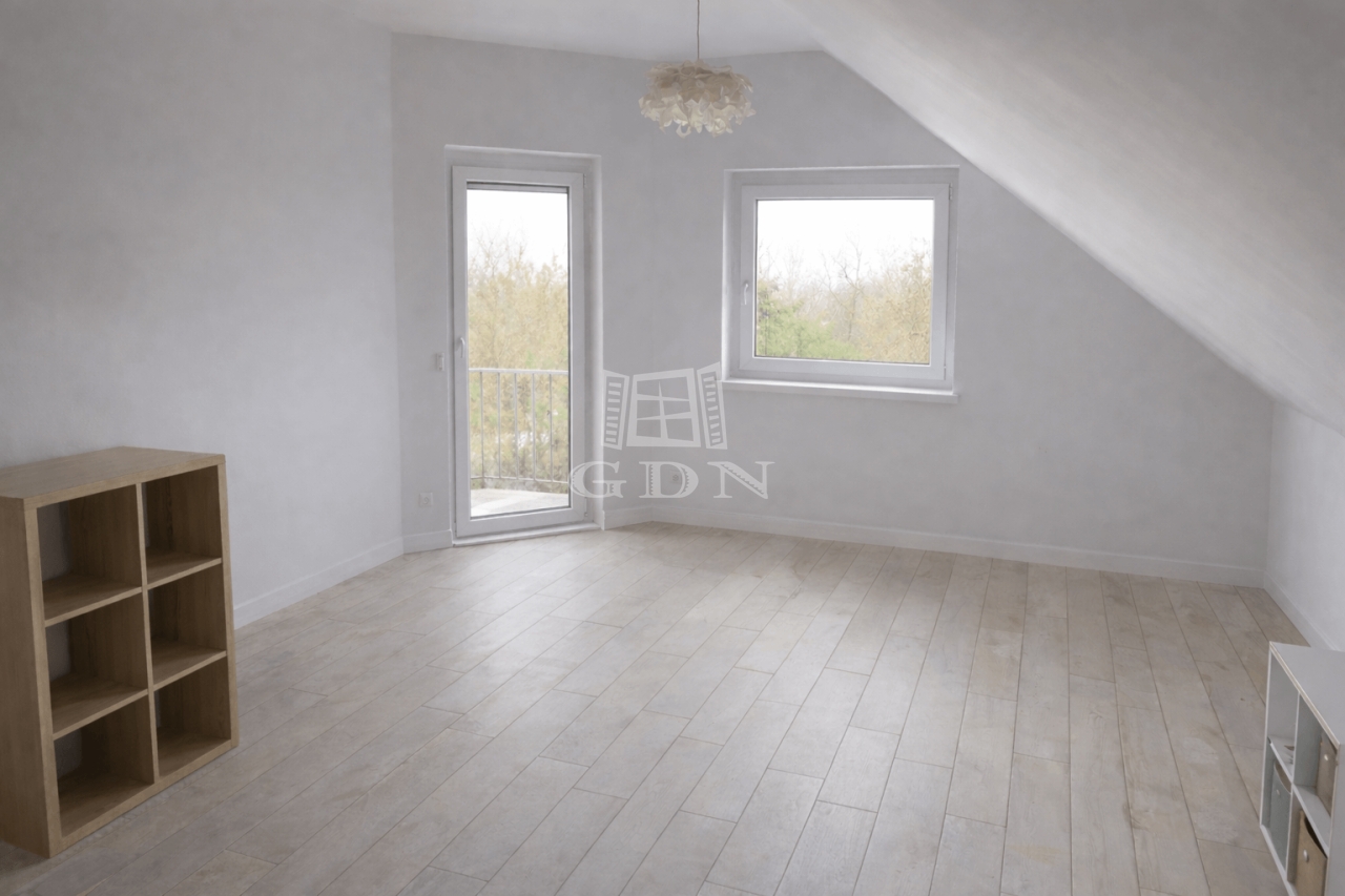 Az emeleten két hálószoba található, melyek közül az egyikből közvetlen kijárat nyílik a nagy méretű erkélyre. A panoráma innen a legszebb: zavartalan kilátás a zsámbéki-medencére, különösen kellemes reggel és naplemente idején.