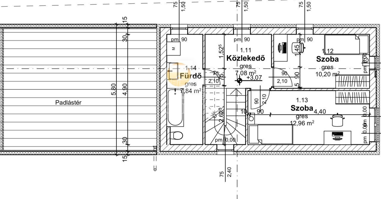 - Az emeleti födém szeglemezes tartószerkezettel készül, amely 25 cm hőszigetelést kap, valamint a mennyezeti tartószerkezeten elhelyezett álmennyezeti gipszkarton rendszer kerül kialakításra a gépészeti rész szerinti területeken integrált mennyezethűtéssel. A padlásterek megközelítésére padlásfeljáró beépítésre kerül.