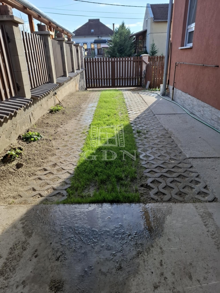 A parkosított, gondozott kert, fedett gépkocsi beállóval, automata kapuval, fedett terasszal, fúrt kúttal, tárolóval várja új tulajdonosát!