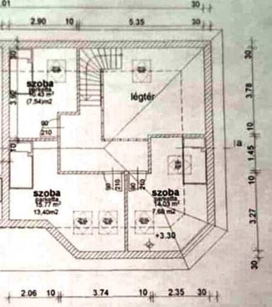 szoba 13,4m2, szoba 7,7m2, szoba 7,6m2, közlekedő-előtér 12m2, mosdó-zuhanyzó 7,15m2, toalett 2,64m2, gardrób 12,76m2;