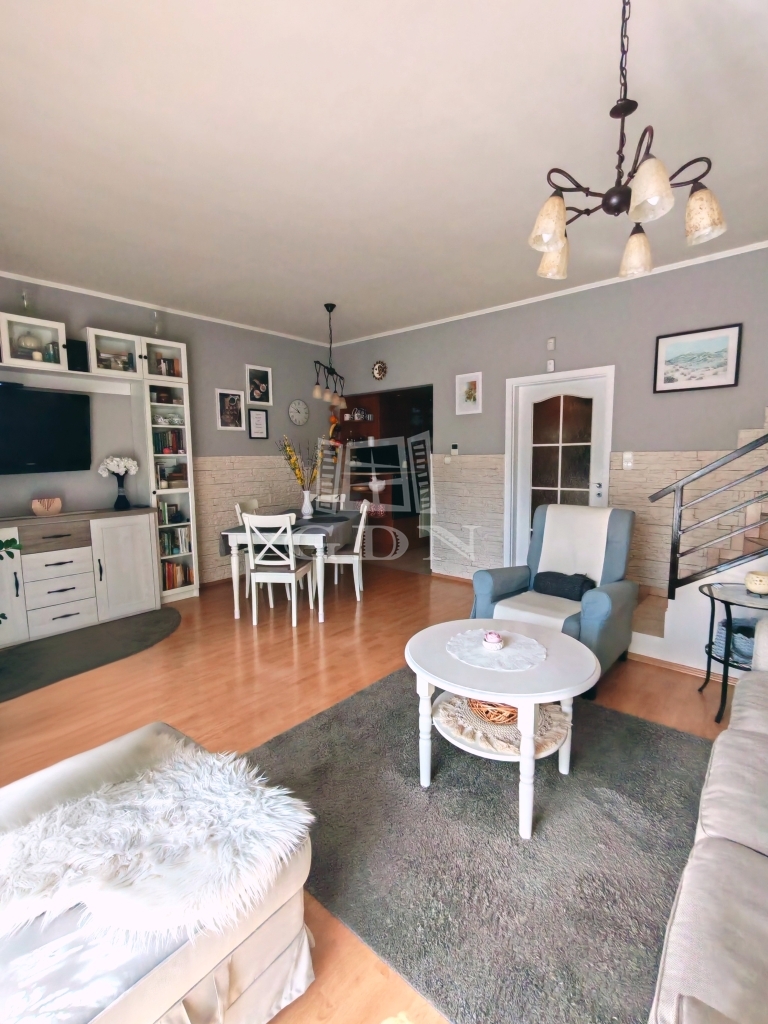 A 90 m²-es lakótér jól átgondolt, élhető elrendezést kínál: a földszinten egy világos, kertkapcsolatos nappali–étkező adja a mindennapok ritmusát, míg az emeleten három különnyíló szoba biztosítja a nyugodt elvonulást. A terek aránya, a délnyugati tájolás és a természetes fény együttese kifejezetten kellemes, otthonos hangulatot teremt.